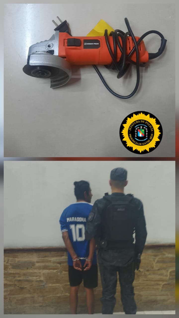 Siendo este interceptado quien al momento de la identificación poseía la amoladora descripta por el damnificado. Se pone en conocimiento a la fiscalía en turno, quien ordena la detención del autor del hecho siendo este mayor de edad (29 años) el cual queda alojado en esta Jefatura Dptal a disposición de la justicia.